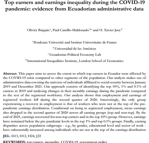Oivier Bargain , Paul Carrillo-Maldonado , and H. Xavier Jara (2023) – Top earners and earnings inequality during the COVIDl-19 pandemic: evidence from Ecuadorian administrative data Read More